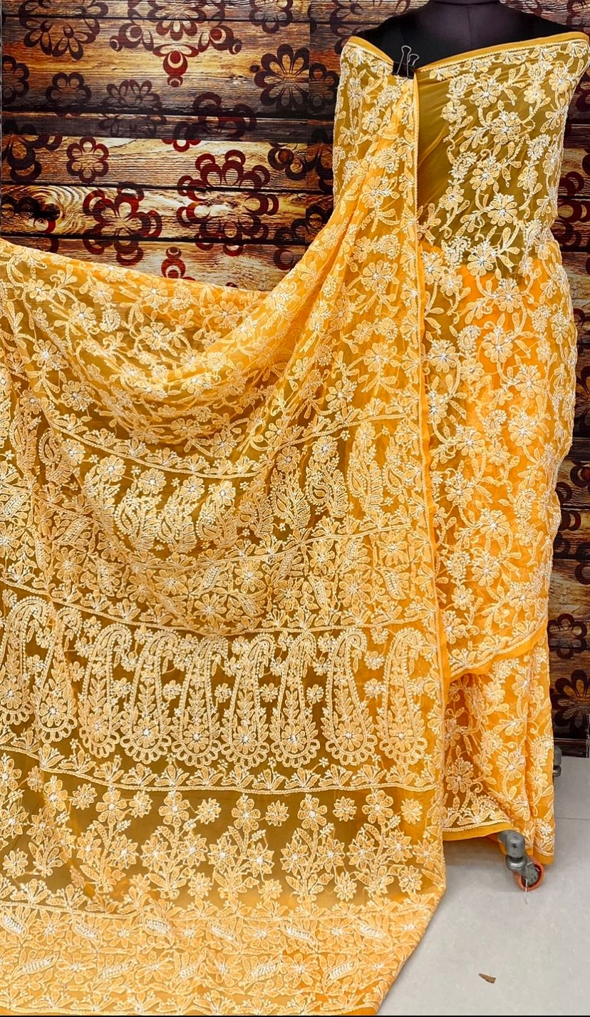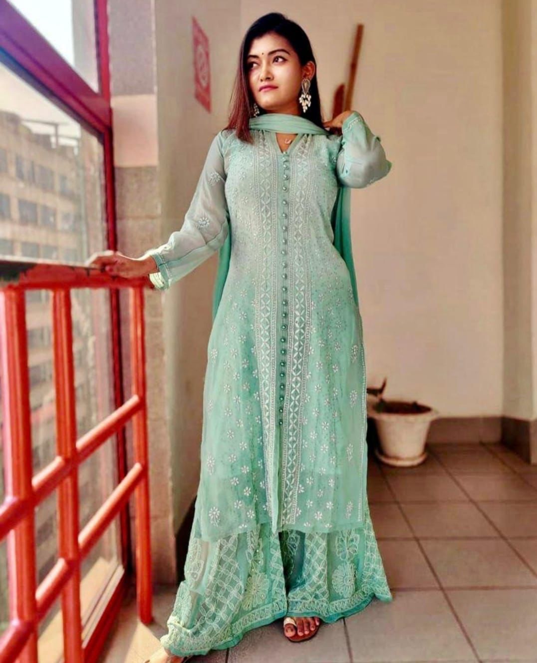 Long Georgette ombre shaded dyed kurti sharara and duppatta set with mirror and fine chikankari work🌸 👇